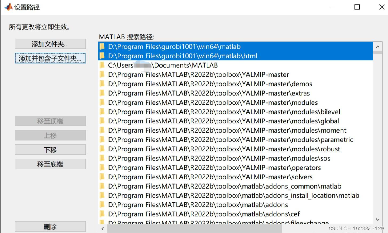 完成Gurobi的注册安装和激活后,在matlab中,将gurobi的路径添加至matlab即可完成配置。目录为Gurobi根目录\win64\matlab