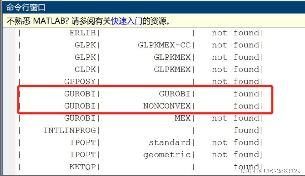 此时,我们输入yalmiptest命令,可以看到gurobi求解器的状态已经是Found了: