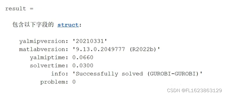 注意,由于optimize函数默认是最小化目标函数,因此如果对于max的目标,应当取一个负号。result是一个变量,用于输出本次求解的信息(求解时间、求解是否成功的标志值等)。若求解成功,则result.problem=0;若求解失败,则result.problem会等于对应的错误类型的值,并且在http://result.info中输出错误信息。
