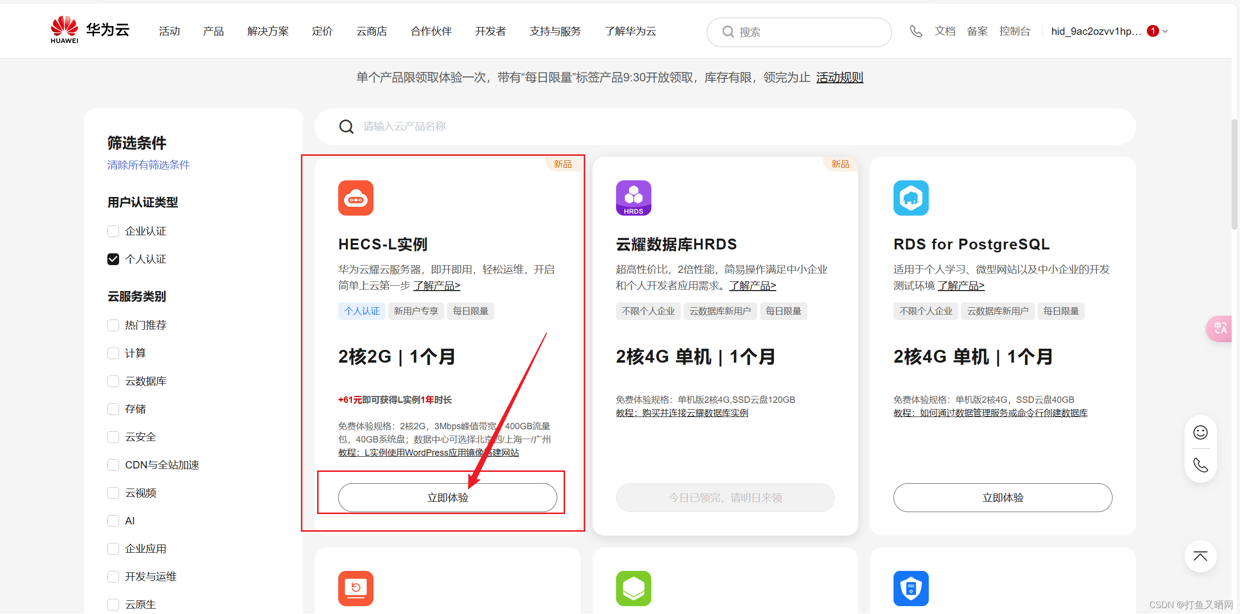 进入体验中心后向下滑, 找到HECS_L实例, 点击立即体验。
