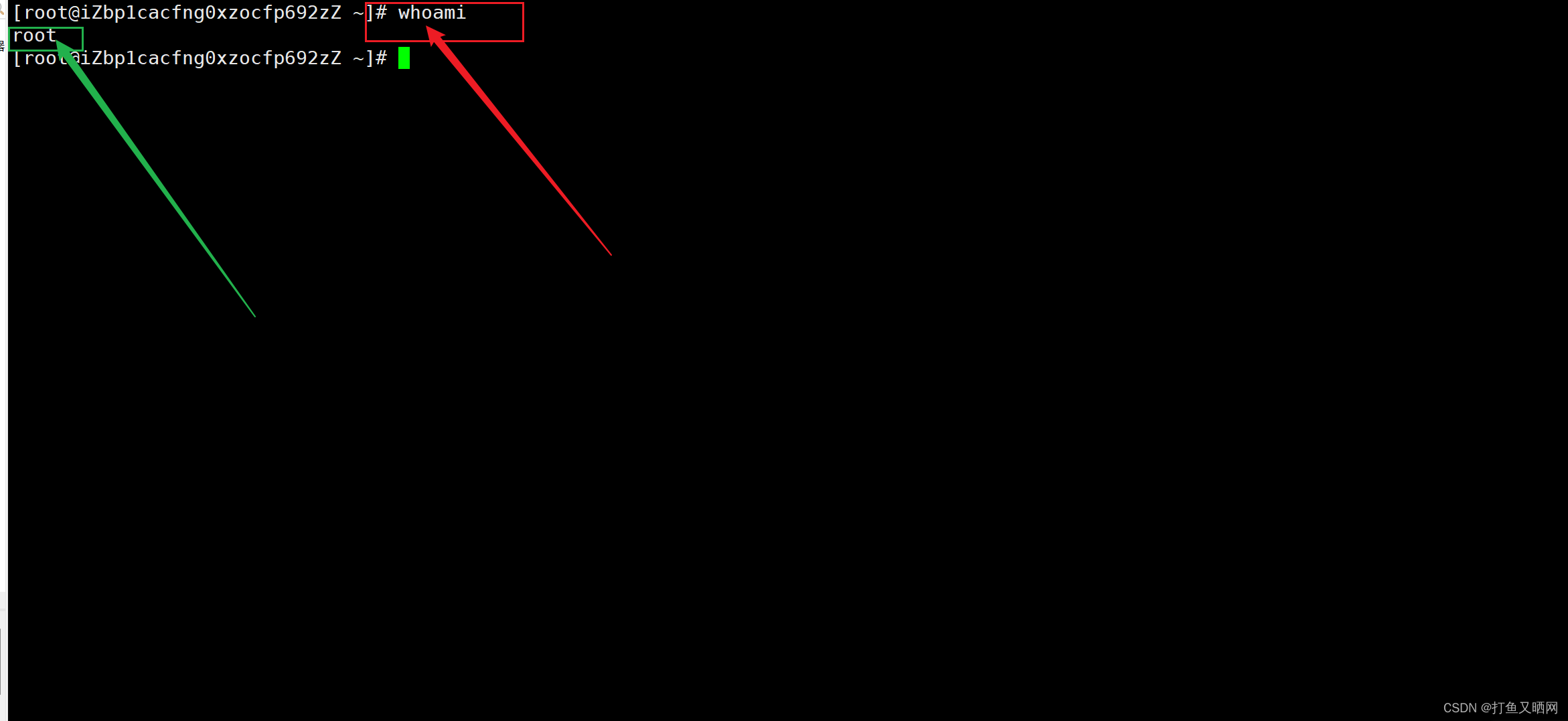 先看一下我们的身份, 输入指令whoami(红框框), 然后就会输出我们账号的身份, 因为我们这里使用的root, 所以输出也是root(绿框框)。