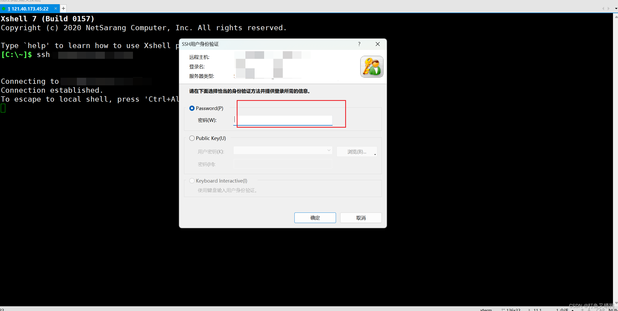 然后就要输入ssh root@你的服务器的公网ip, 输入后就可以进入看到要输入你的服务器密码了, 这个密码就是上面服务器配置的时候重置的密码, 如果没有重置密码就进不去。(注意, 连接的时候最好不要用校园网, 有些学校的校园网是阻止远程连接的。)