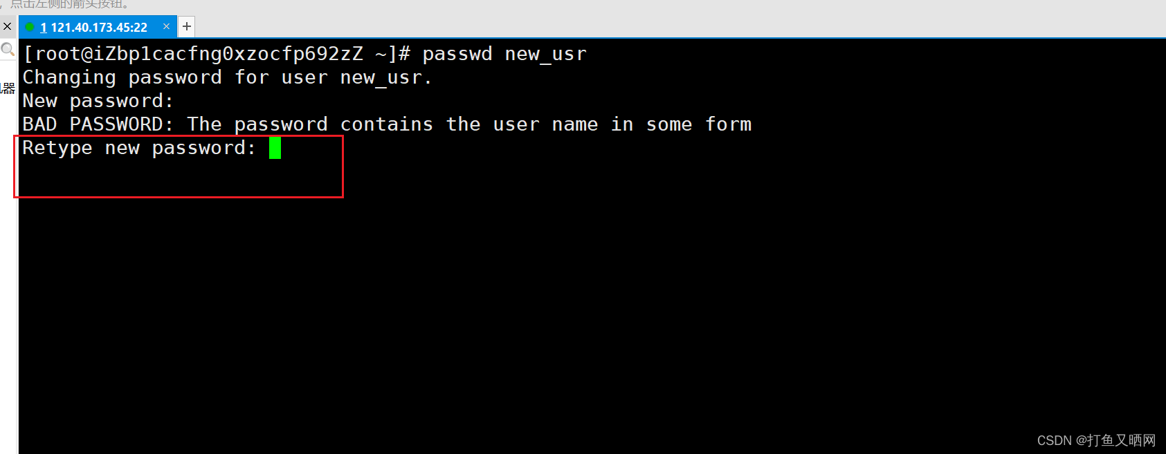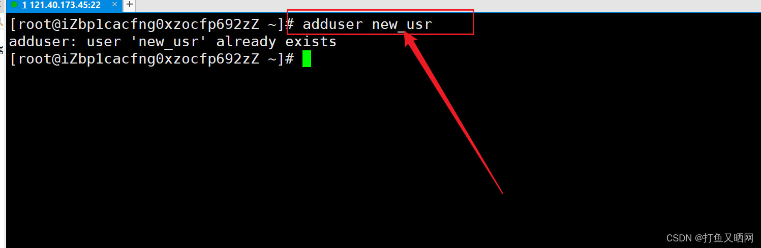输入adduser指令: adduser + 你要添加的用户名。 (这里博主已经创了一个名叫new_usr的用户了)