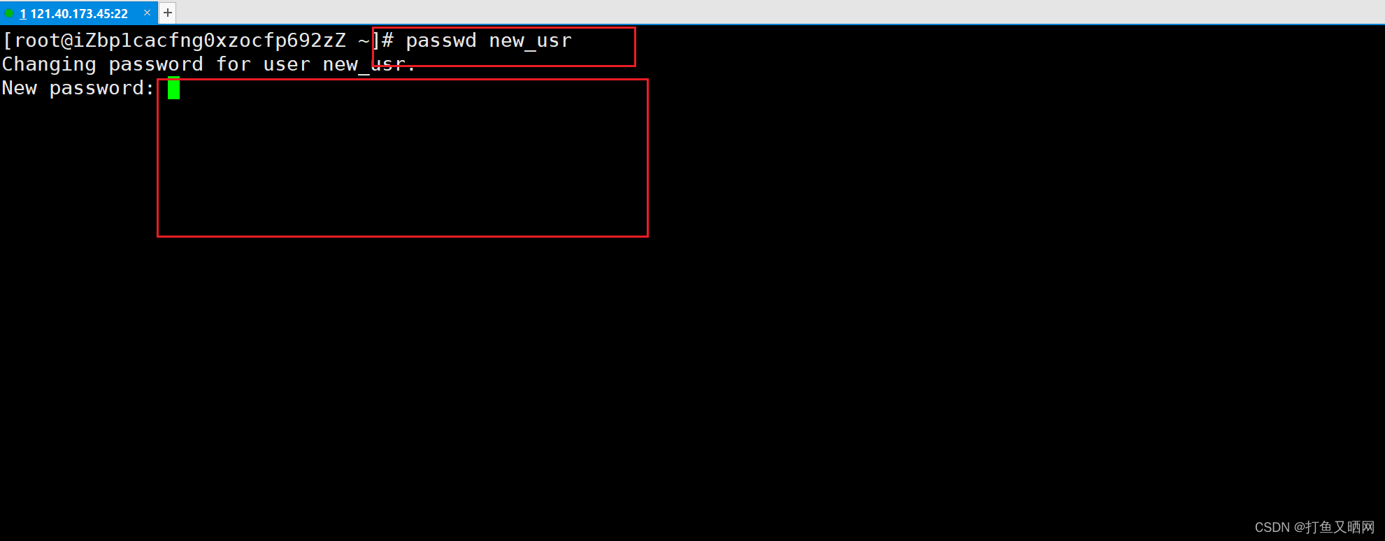 然后passwd + 用户名来修改这个用户的密码。 注意, 这里输入的密码并不回显, 而且输入后会有确认输入。 (密码务必复杂, 不然很容易被盗掉,博主认为这里的密码保险程度不如我们在手机或者windows上面的客户端那些密码)