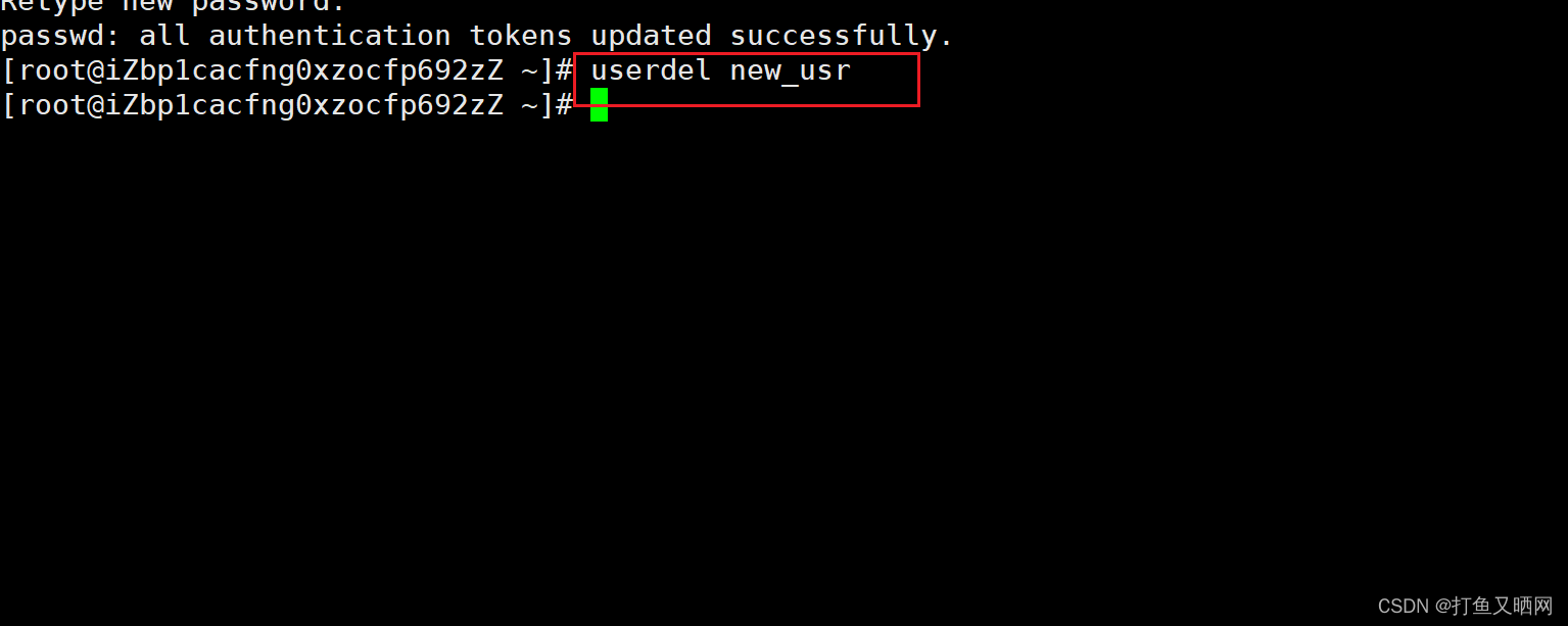 输入userdel + 要删除的用户名, 即可删除普通用户。