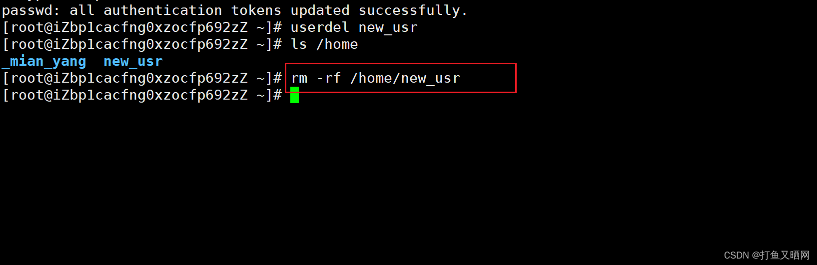 然后删掉用户的文件夹:rm -rf + 文件路径(rm是删除文件。 -rf意思是强制删除目录。)