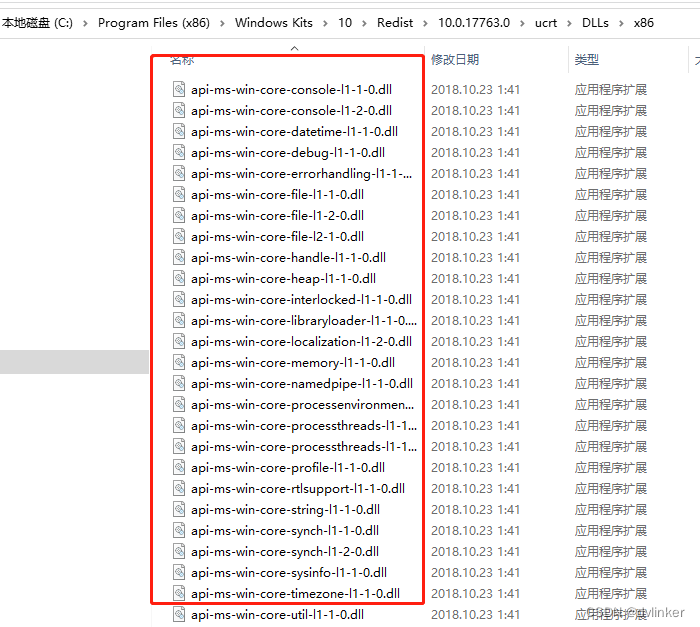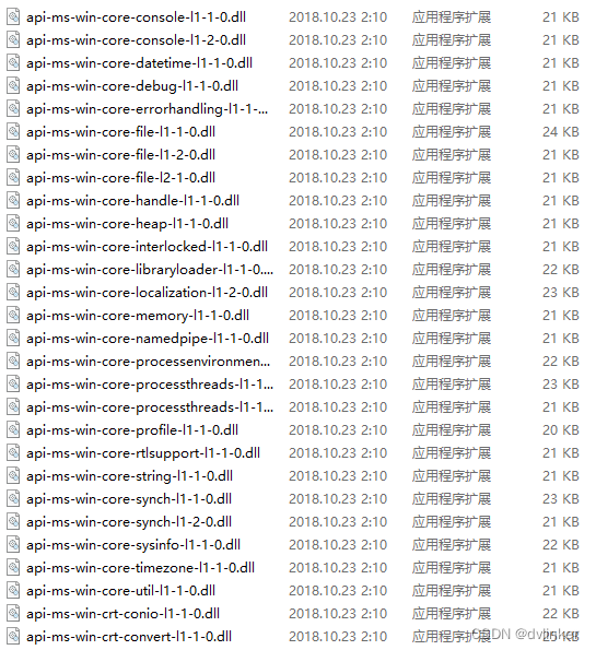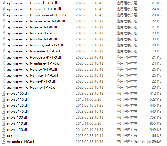 UCRT,全称为The Universal CRT,Windows系统通用运行时库,主要由ucrtbase.dll以及api-ms-win-开头的多个dll库,如下所示: