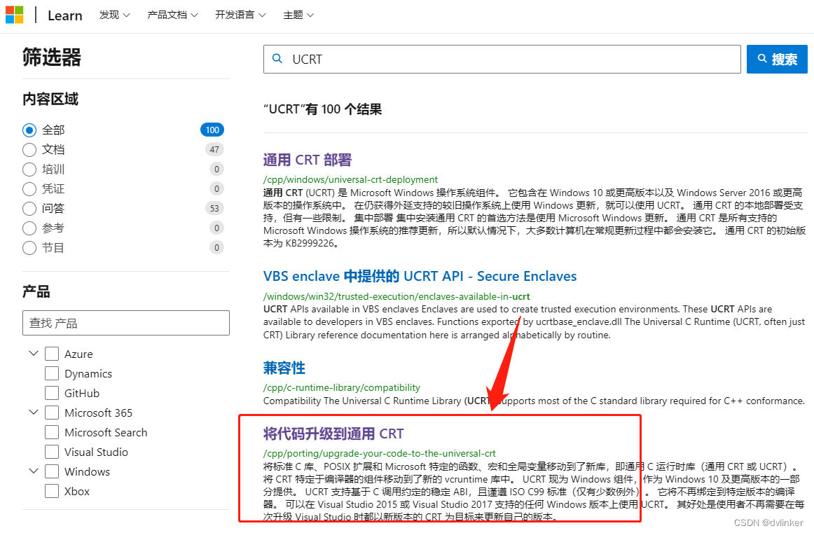 微软官网也有介绍UCRT通用运行时库的相关介绍,直接在Microsoft Learn: Build skills that open doors in your career上搜索UCRT,会搜索到如下结果: