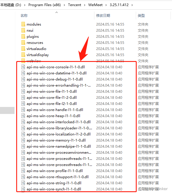 后来查看腾讯会议、WPS和企业微信等程序的安装目录中均有带上多个以api-ms-win-开头多个dll库: