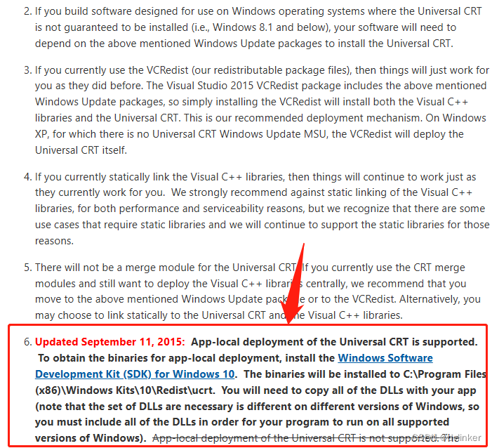Introducing the Universal CRThttps://devblogs.microsoft.com/cppblog/introducing-the-universal-crt/其中下面一段话讲到了如何去获取the Universal CRT系统通用运行时库,如下所示: