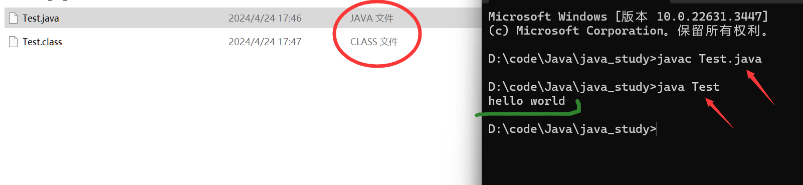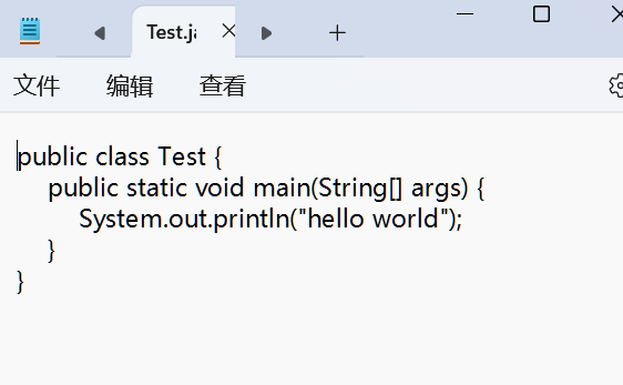 在记事本写运行java代码的时候,我们可以在文件所在目录下打开cmd 窗口,并输入javac这个命令,输入之后会生成.class文件,之后输入java命令运行Test文件就会出来hello world这个运行结果。