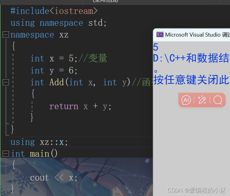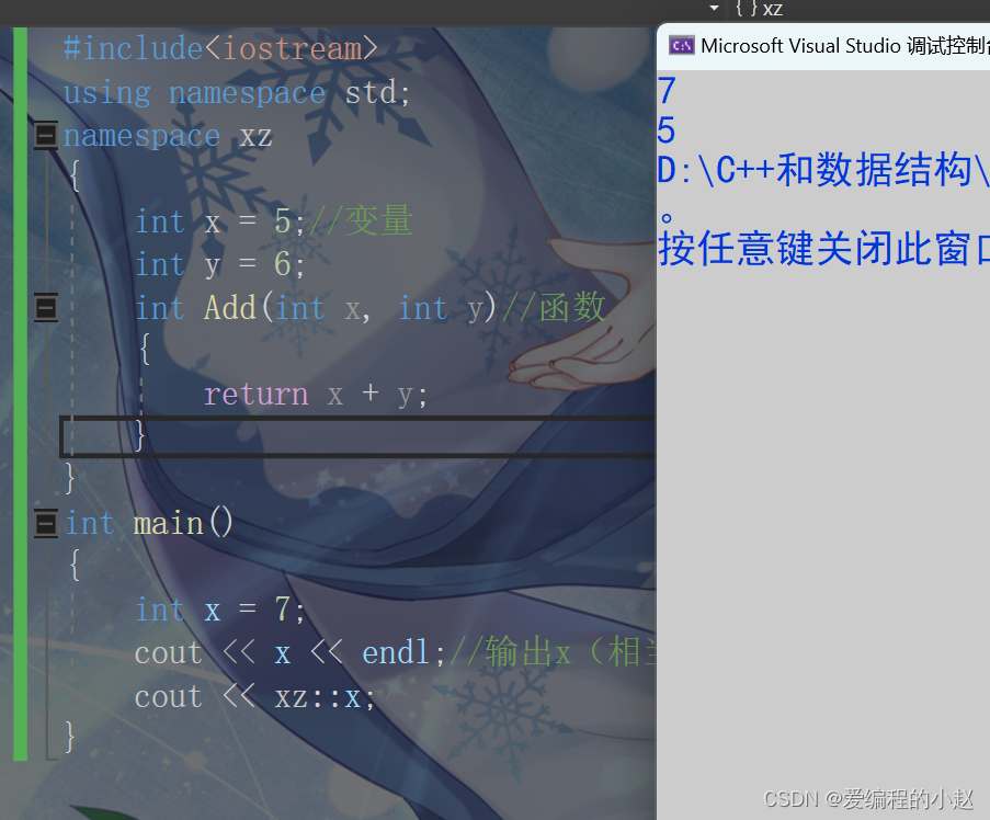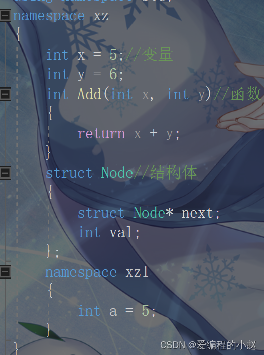 namespace xz//开辟一个叫xz的空间域{ int x = 5;//设立变量 int y = 6; int Add(int x, int y)//设立函数 { return x + y; }}