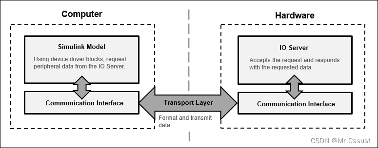 分布式仿真,也称半实物仿真,Mathworks官方的说法是Connected I/O Simulation,顾名思义就是仿真模型的运行不全在Computer上。Contrl Model被分成两部分,纯算法的Model仍在Computer上运行,I/O之类的外设在外部MCU(I/O Server)上执行,Computer和外部MCU之间通过Serial协议进行连接。当仿真运行时,Model Block向IO Server发送命令和请求数据。Plane Model用真实世界中的物理实体替代,并受IO Server控制,整体框架示例如下: