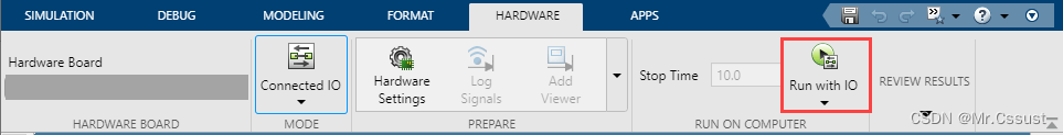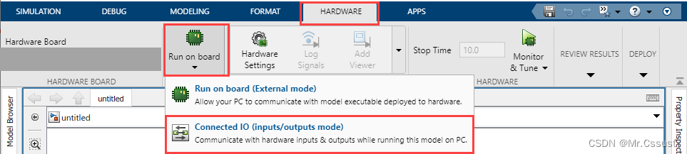 在Simulink的Hardware工具页中, 点击Run on Board下拉按钮, 然后点击Connected I/O (inputs/outputs mode)按钮,示例如下: