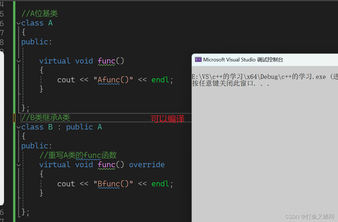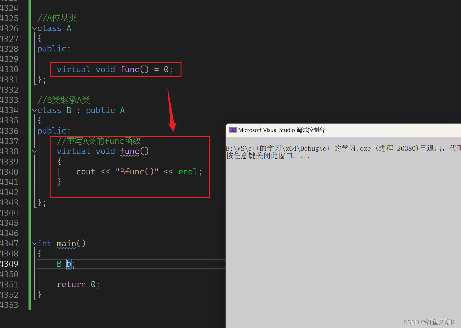 //A位基类class A {public:virtual void func() {cout << "Afunc()" << endl;}};//B类继承A类class B : public A{public://重写A类的func函数virtual void func() //注意, 这里的virtual可以不写, 因为编译器默认这里是加了virtual的{cout << "Bfunc()" << endl;}};