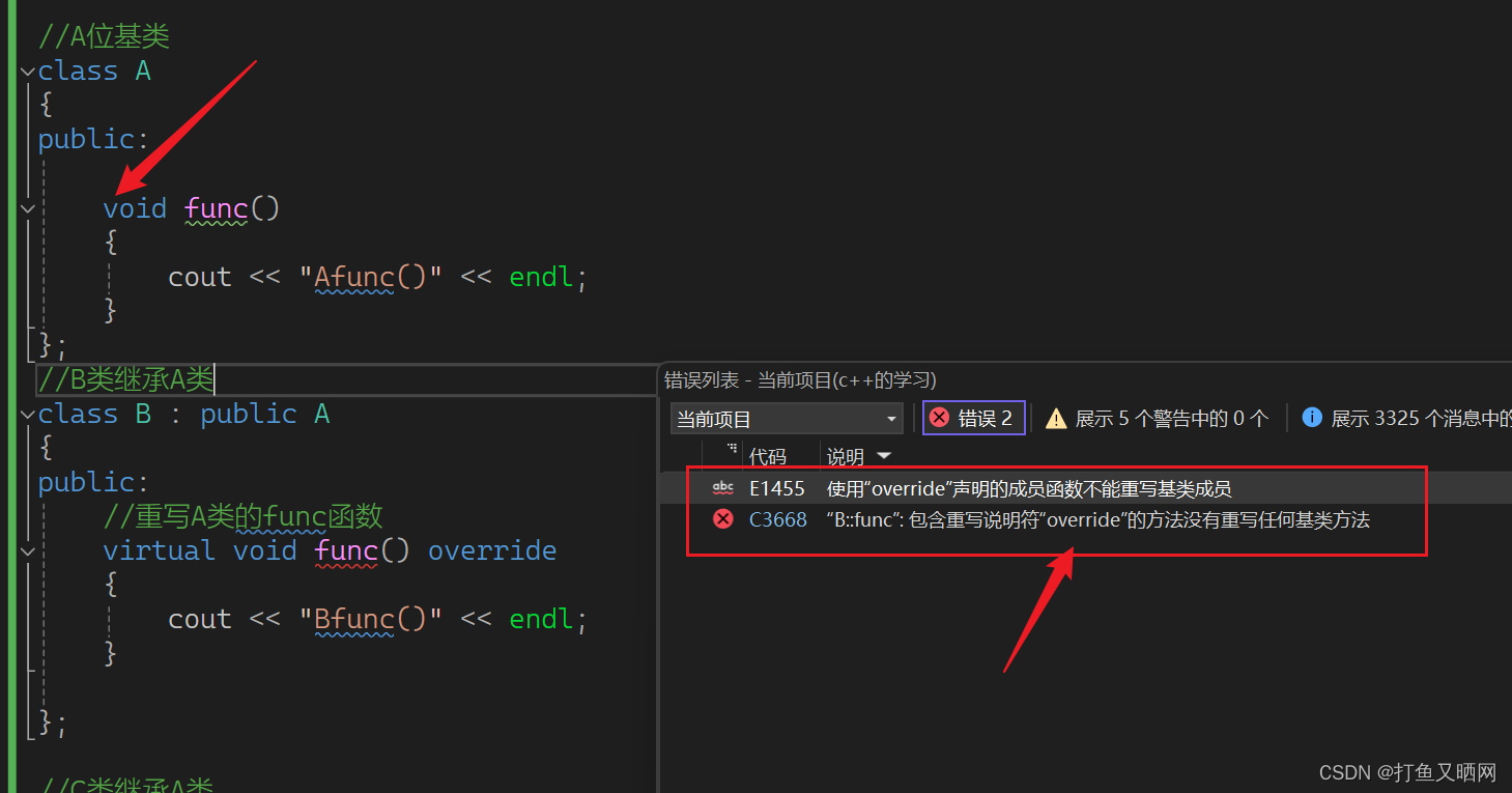 //A位基类class A{public:virtual void func(){cout << "Afunc()" << endl;}};//B类继承A类class B : public A{public://重写A类的func函数virtual void func() override{cout << "Bfunc()" << endl;}};