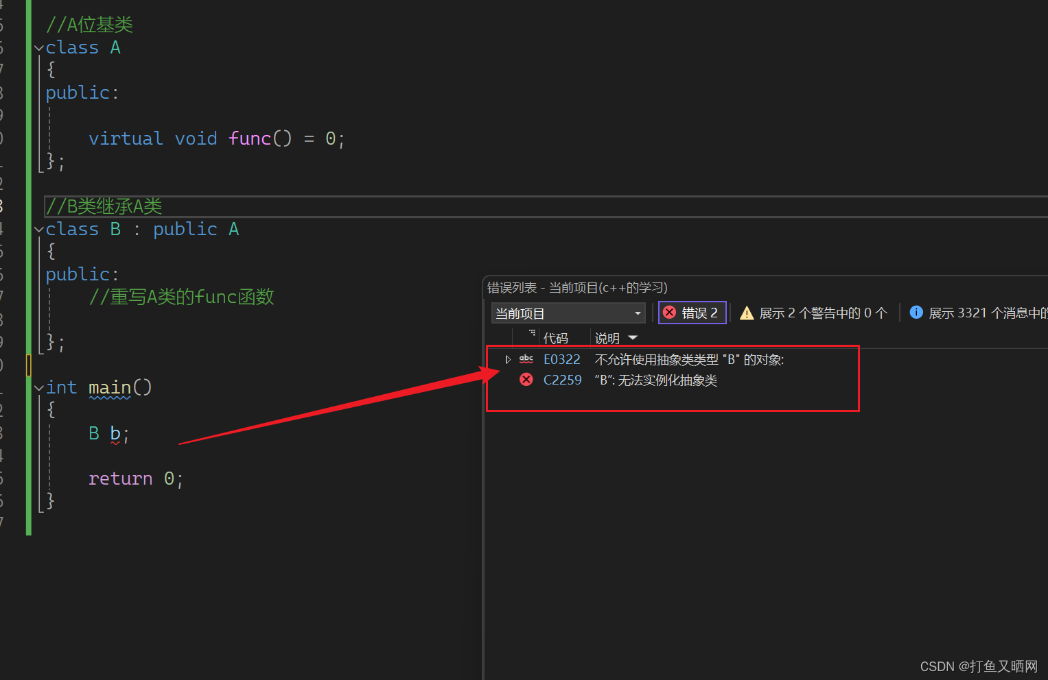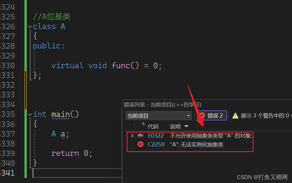 //A位基类class A{public:virtual void func() = 0;};int main() {A a;return 0;}