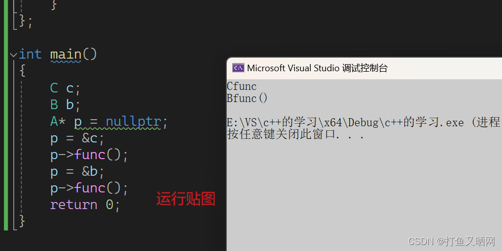 //A位基类class A {public:virtual void func() {cout << "Afunc()" << endl;}};//B类继承A类class B : public A{public:virtual void func() {cout << "Bfunc()" << endl;}};//C类继承A类class C : public A{virtual void func() {cout << "Cfunc" << endl;}};int main() {C c;B b;A* p = nullptr;p = &c;p->func();p = &b;p->func();return 0;}