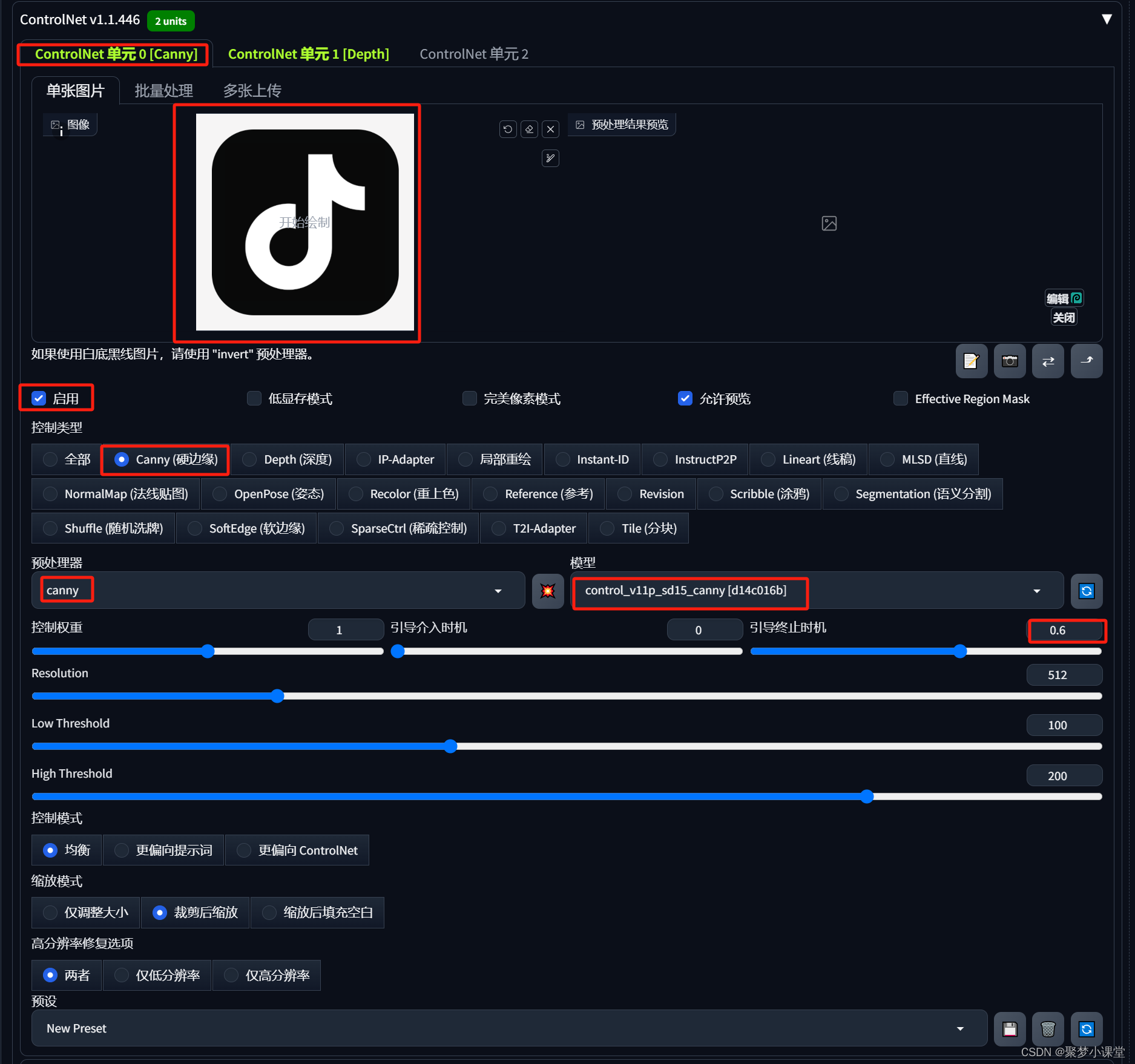 第六步,设置ControlNet 1:用canny来锁定图形的边缘;