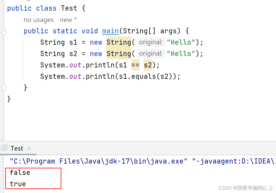 public class Test { public static void main(String[] args) { String s1 = new String("Hello"); String s2 = new String("Hello"); }}