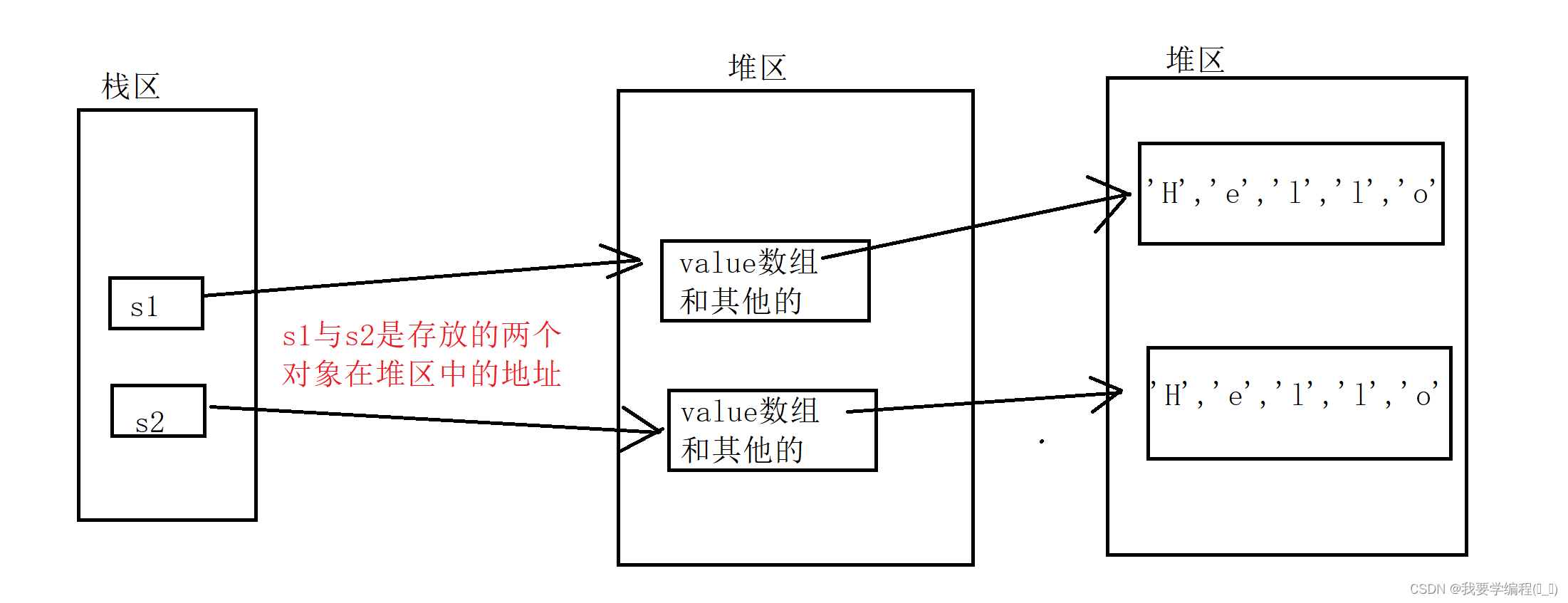 然而,当你使用 String s1 = new String("Hello"); 方式创建字符串时,会创建一个新的字符串对象,即使内容相同,这个新对象也会在堆上分配独立的内存空间,而不是从字符串常量池中获取。所以,String s1 = new String("Hello"); 和 String s1 = new String("Hello"); 分别创建了两个不同的字符串对象,尽管它们的内容都是 "Hello",但它们在内存中的地址不同。因此,使用 s1 == s2 比较时结果为 false,因为它们指向不同的对象实例。但是,如果你使用 s1.equals(s2) 方法进行比较,结果会是 true,因为 equals 方法比较的是对象的内容,而不是它们的引用。