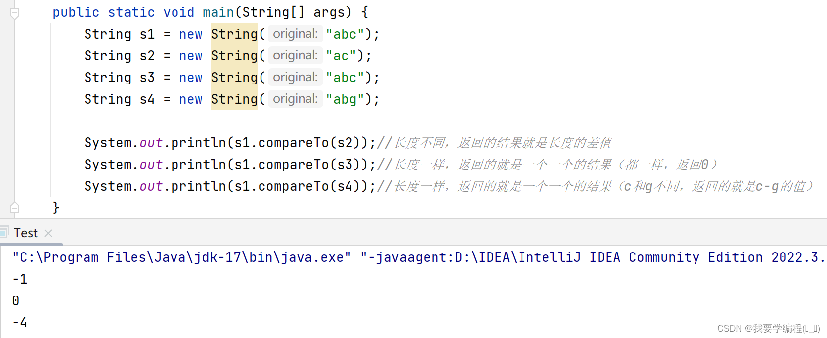public class Test { public static void main(String[] args) { String s1 = new String("abc"); String s2 = new String("ac"); String s3 = new String("abc"); String s4 = new String("abg"); //长度不同,返回的结果就是长度的差值 System.out.println(s1.compareTo(s2)); //长度一样,返回的就是一个一个的结果(都一样,返回0) System.out.println(s1.compareTo(s3)); //长度一样,返回的就是一个一个的结果(c和g不同,返回的就是c-g的值) System.out.println(s1.compareTo(s4)); }}