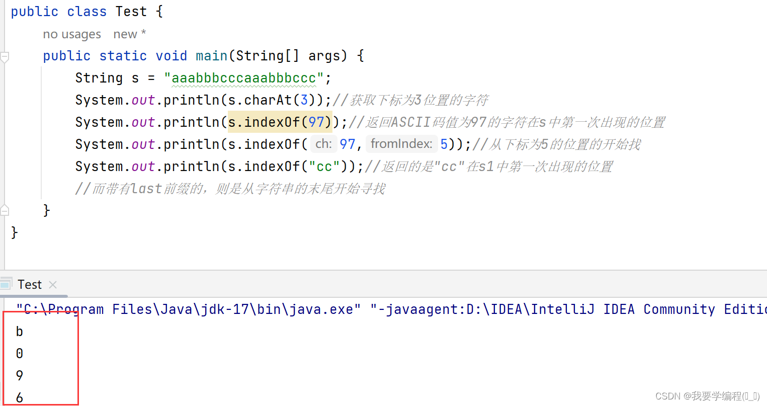 public class Test { public static void main(String[] args) { String s = "aaabbbcccaaabbbccc"; System.out.println(s.charAt(3));//获取下标为3位置的字符 System.out.println(s.indexOf(97));//返回ASCII码值为97的字符在s中第一次出现的位置 System.out.println(s.indexOf(97,5));//从下标为5的位置的开始找 System.out.println(s.indexOf("cc"));//返回的是"cc"在s1中第一次出现的位置 //而带有last前缀的,则是从字符串的末尾开始寻找 }}