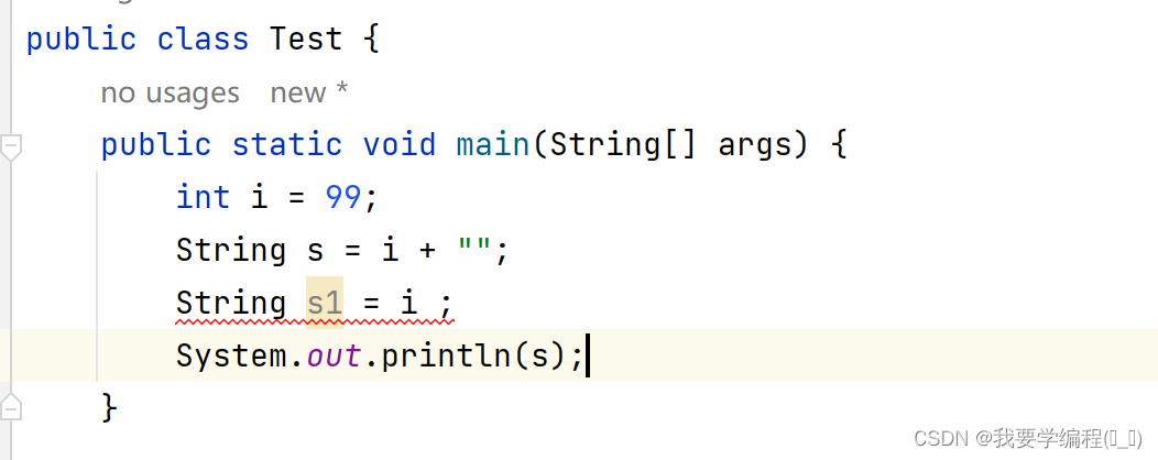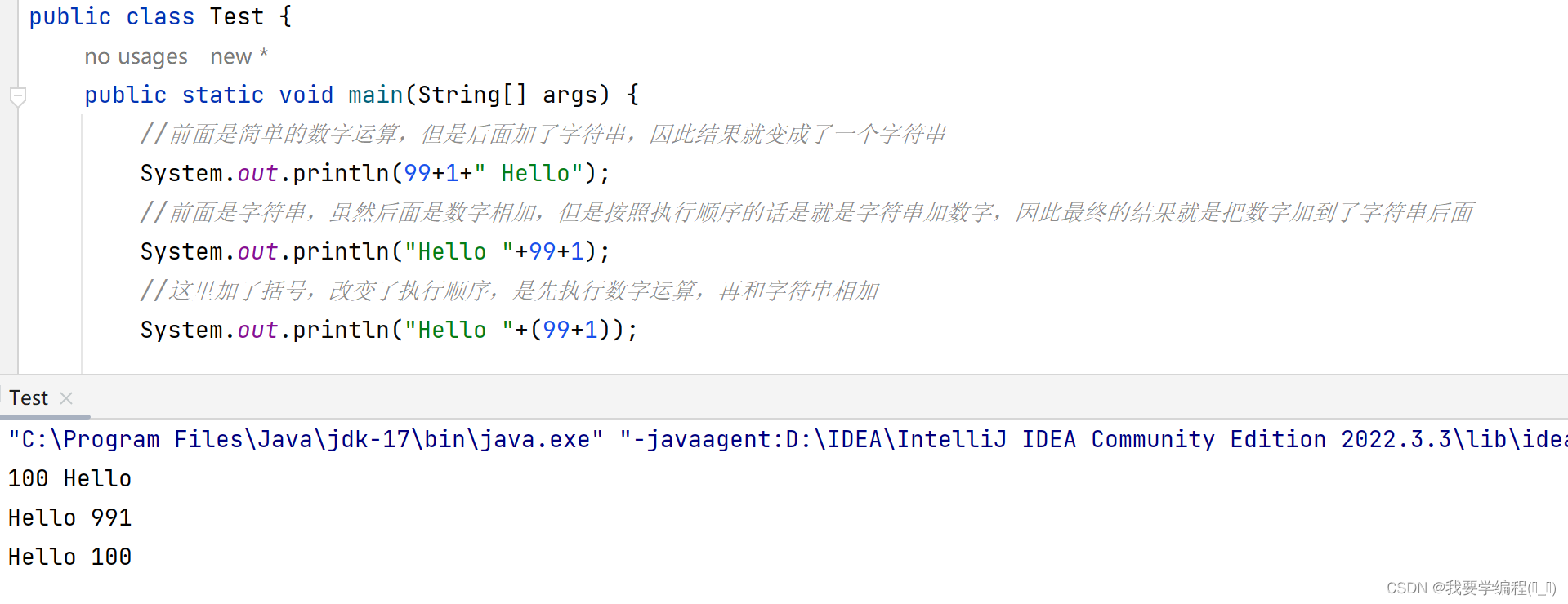 public class Test { public static void main(String[] args) { //前面是简单的数字运算,但是后面加了字符串,因此结果就变成了一个字符串 System.out.println(99+1+" Hello"); //前面是字符串,虽然后面是数字相加,但是按照执行顺序的话是就是字符串加数字,因此最终的结果就是把数字加到了字符串后面 System.out.println("Hello "+99+1); //这里加了括号,改变了执行顺序,是先执行数字运算,再和字符串相加 System.out.println("Hello "+(99+1)); }}