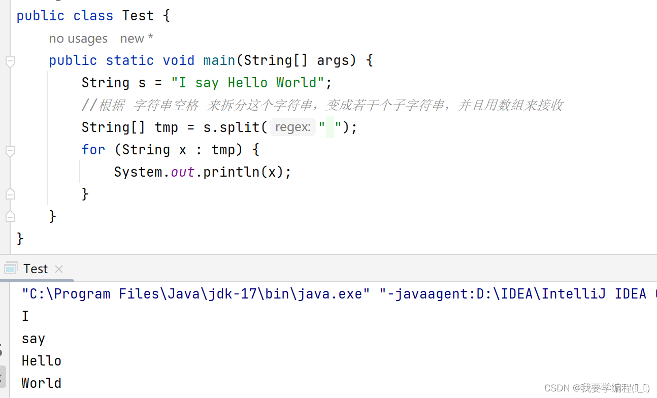 public class Test { public static void main(String[] args) { String s = "I say Hello World"; //根据 字符串空格 来拆分这个字符串,变成若干个子字符串,并且用数组来接收 String[] tmp = s.split(" "); for (String x : tmp) { System.out.println(x); } }}
