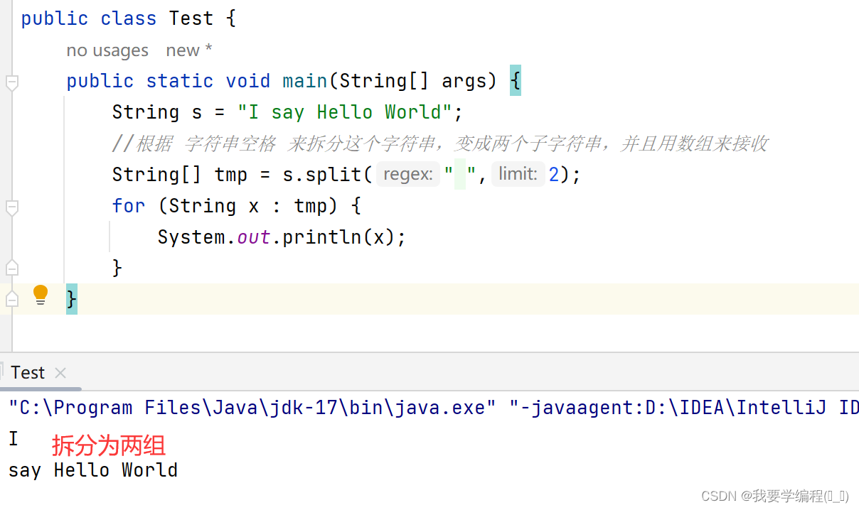public class Test { public static void main(String[] args) { String s = "I say Hello World"; //根据 字符串空格 来拆分这个字符串,变成两个子字符串,并且用数组来接收 String[] tmp = s.split(" ",2); for (String x : tmp) { System.out.println(x); } }}