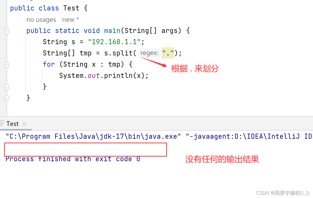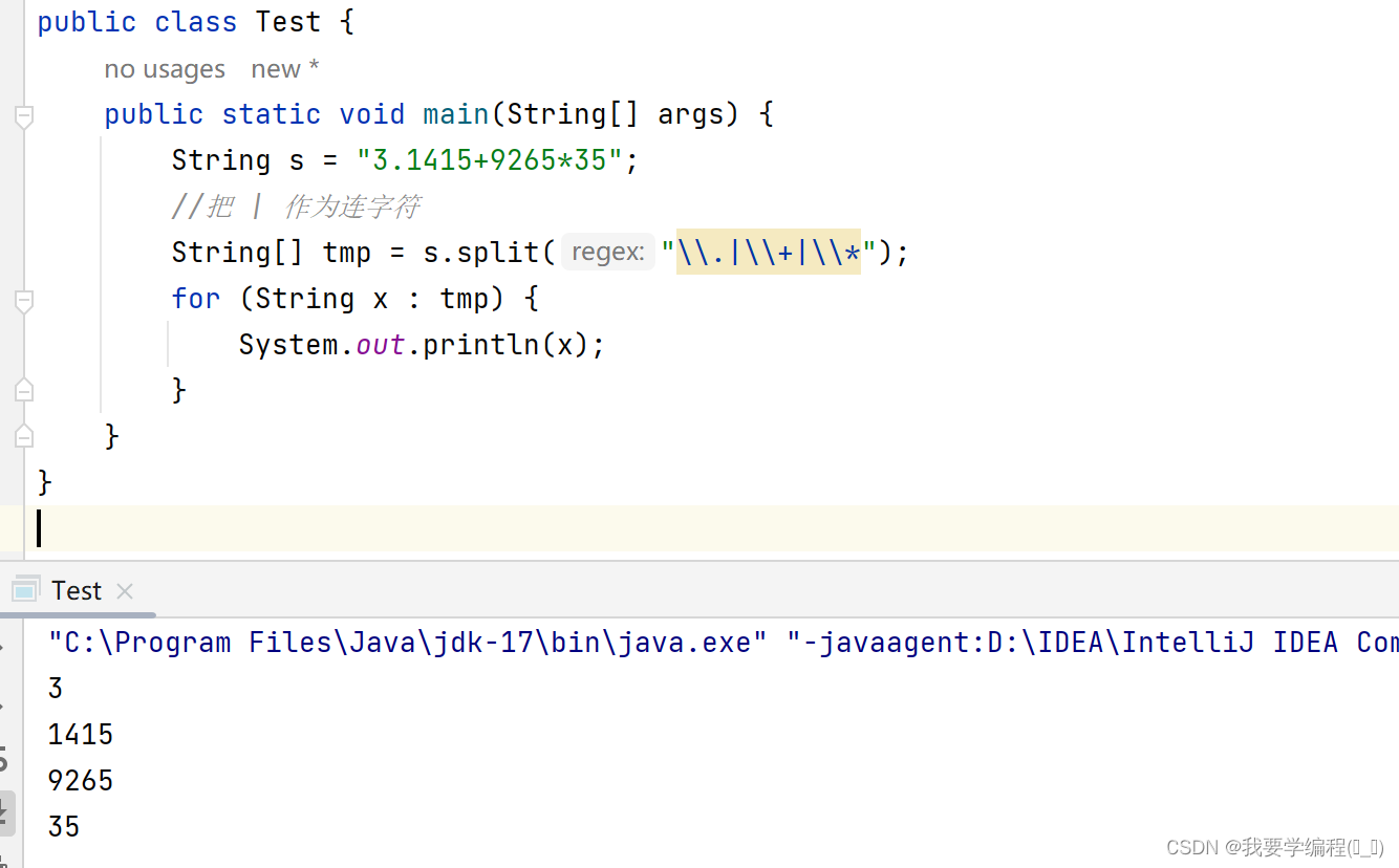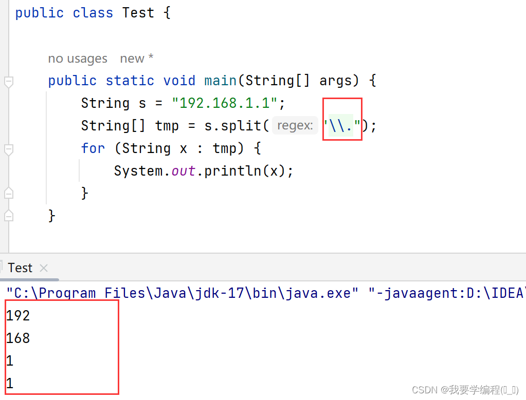 第二点想要表达的意思是如果原字符串中存在 \\ (有时候不存在一个 \ 的情况,例如在数字中 \ddd,这就变成了一个转义字符了,因此这时候如果我们要表述一个 \ ,就得用用两个 \\ ),而我们想要以这个来作为划分标准的话,怎么办呢?用两个 \\ ,肯定是不行的,因为这是表示一个 \ ,因此,我们就得用 \\ 表示一个 \ ,因此 \\\\ 就表示 \\ 了。
