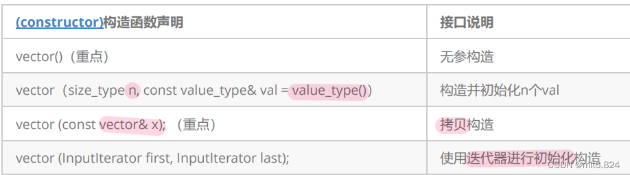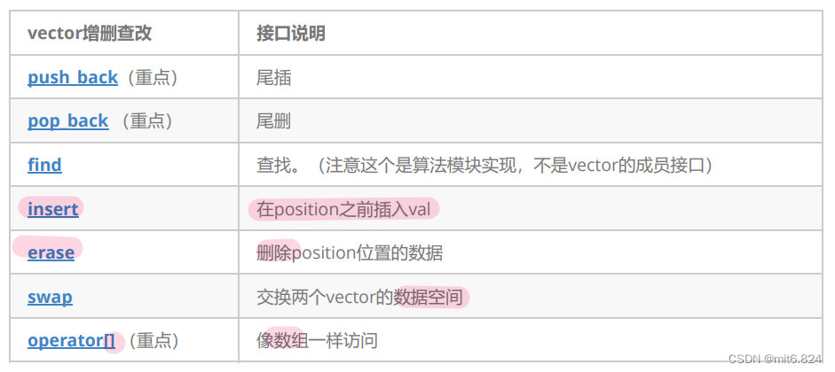 vector学习时一定要学会查看文档:vector的文档介绍,vector在实际中非常的重要,在实际中我们熟悉常 见的接口就可以,下面列出了哪些接口是要重点掌握的。
