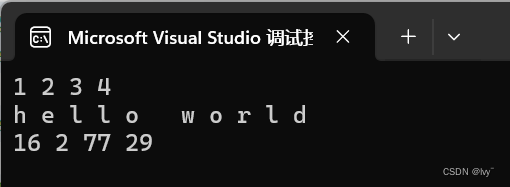 void test1(){vector<int> v1{ 1,2,3,4 };// 自己类型的迭代器vector<int> v3(v1.begin(), v1.end());for (auto e : v3){cout << e << " ";}cout << endl;string str("hello world");vector<char> v4(str.begin(), str.end());for (auto e : v4){cout << e << " ";}cout << endl;int a[] = { 16,2,77,29 };vector<int> v5(a, a + 4);for (auto e : v5){cout << e << " ";}cout << endl;}