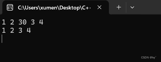 void test5(){// 使用列表方式初始化,C++11新语法vector<int> v{ 1, 2, 3, 4 };// 在指定位置前插入值为val的元素,比如:3之前插入30,如果没有则不插入// 1. 先使用find查找3所在位置auto pos = find(v.begin(), v.end(), 3);if (pos != v.end()) { // 如果找到了3// 注意:insert返回指向新插入元素的迭代器auto newPos = v.insert(pos, 30);//定义新位置for (auto e : v)cout << e << ' ';cout << endl;v.erase(newPos); // 移除新位置}for (auto m : v)cout << m << ' ';cout << endl;}