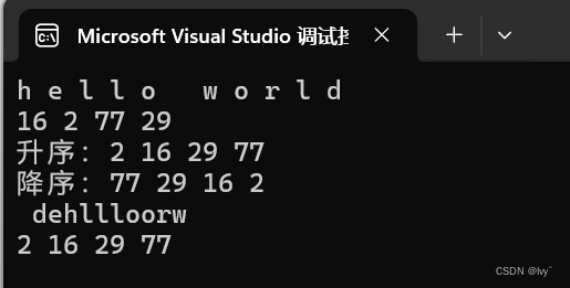 void test(){string str("hello world");vector<char> v4(str.begin(), str.end());for (auto e : v4){cout << e << " ";}cout << endl;int a[] = { 16,2,77,29 };vector<int> v5(a, a + 4);for (auto e : v5){cout << e << " ";}cout << endl<<"升序:";// 升序 < // lesssort(v5.begin(), v5.end());//sort(v5.rbegin(), v5.rend());for (auto e : v5){cout << e << " ";}cout << endl<<"降序:";// 降序 >//greater<int> gt;//sort(v5.begin(), v5.end(), gt);sort(v5.begin(), v5.end(), greater<int>());for (auto e : v5){cout << e << " ";}cout << endl;//void(*func)();sort(str.begin(), str.end());cout << str << endl;sort(a, a + 4);for (auto e : a){cout << e << " ";}cout << endl;}