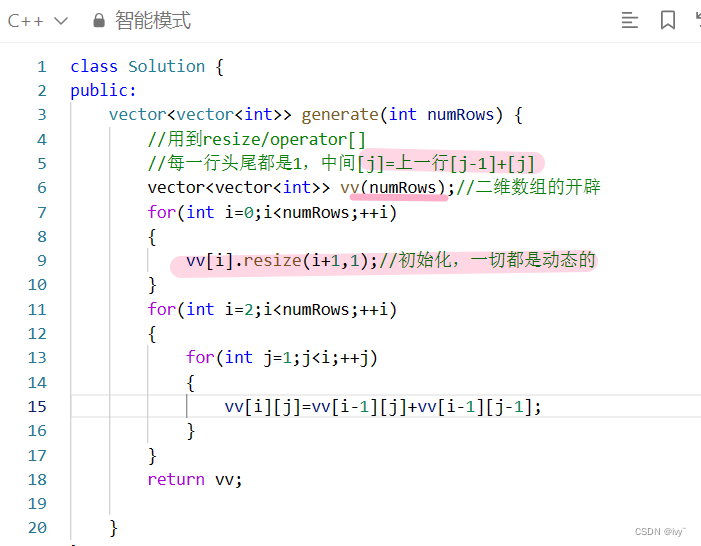 通过指定numRows来初始化vv,即开辟了numRows行。每一行可以通过vv[i]来访问,其中i表示行号。每一行中的元素可以通过vv[i][j]来访问,其中j表示列号。