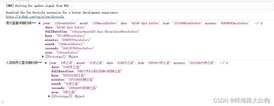 const unitObj = { beforeUnit: 'before', afterUnit: 'after', yearUnit: 'year', monthUnit: 'month', dateUnit: ' days ', hourUnit: 'hour', minutesUnit: 'min', secondUnit: 'sec' } const showData = timeBox.getDistanceNow('1908-12-02 06:00:00', unitObj); // 溥仪登基啦 console.log('溥仪登基详细时间===', showData); const showData1 = timeBox.getDistanceNow('2030-04-19 20:15:59'); // 移民火星啦 console.log('人类移民火星详细时间===', showData1);
