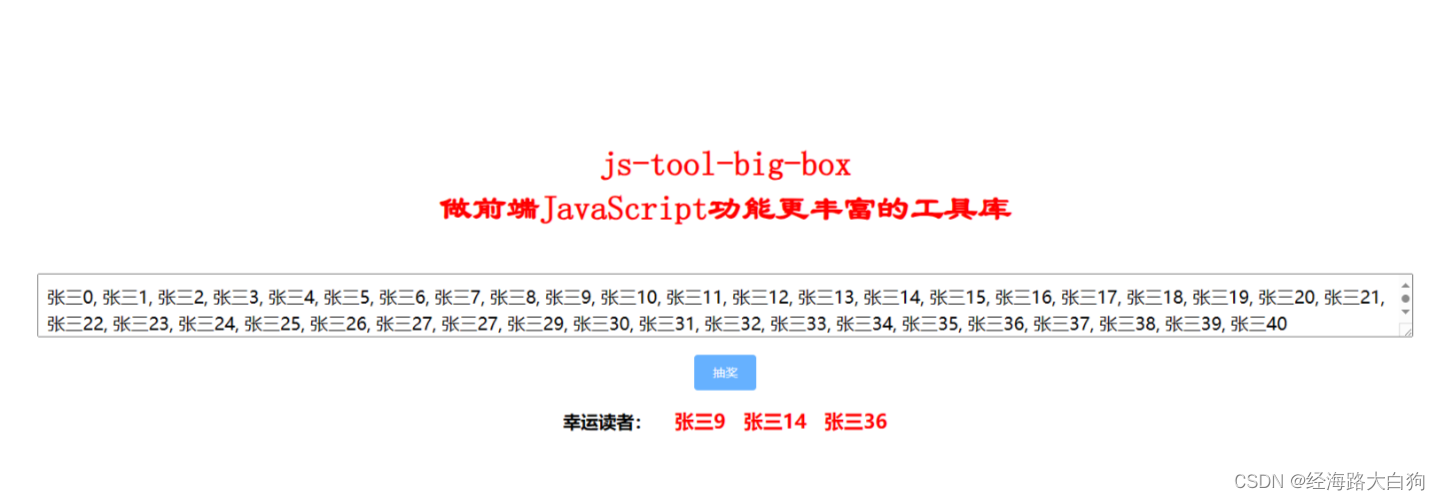 const peopleData = '张三0, 张三1, 张三2, 张三3, 张三4, 张三5, 张三6, 张三7, 张三8, 张三9, 张三10, 张三11, 张三12, 张三13, 张三14, 张三15, 张三16, 张三17, 张三18, 张三19, 张三20, 张三21, 张三22, 张三23, 张三24, 张三25, 张三26, 张三27, 张三27, 张三29, 张三30, 张三31, 张三32, 张三33, 张三34, 张三35, 张三36, 张三37, 张三38, 张三39, 张三40';this.luckPeople = dataBox.luck(peopleData, 3);