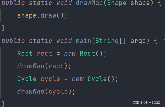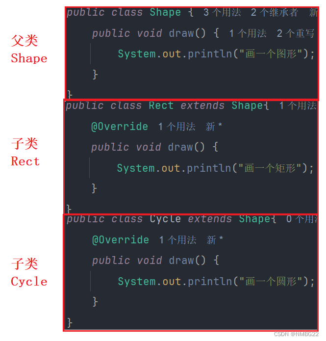 以上三个类, 在子类 Rect 与 Cycle 中,重写了父类中的draw 方法.