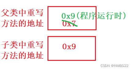 在程序编译的时候先找到的是 父类中重写方法的地址, 等到程序运行的时候再将父类中重写方法的地址替换为 子类中重写方法的地址, 这时调用的就是子类的重写方法. 这样就实现了动态绑定.