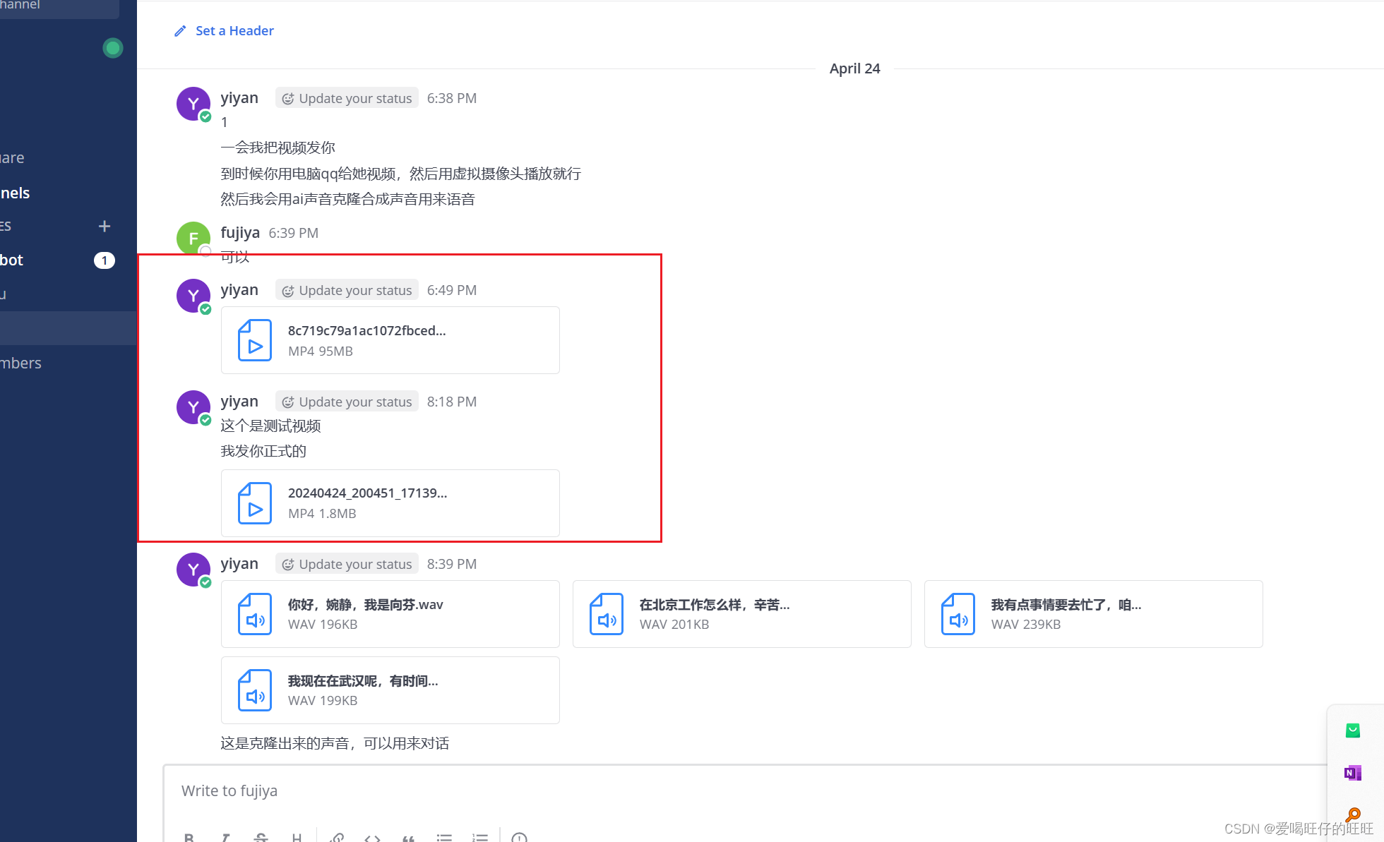 登录yiyan的账号 查看他和fujiya的聊天记录 可以看到yiyan发了两个视频给fujiya