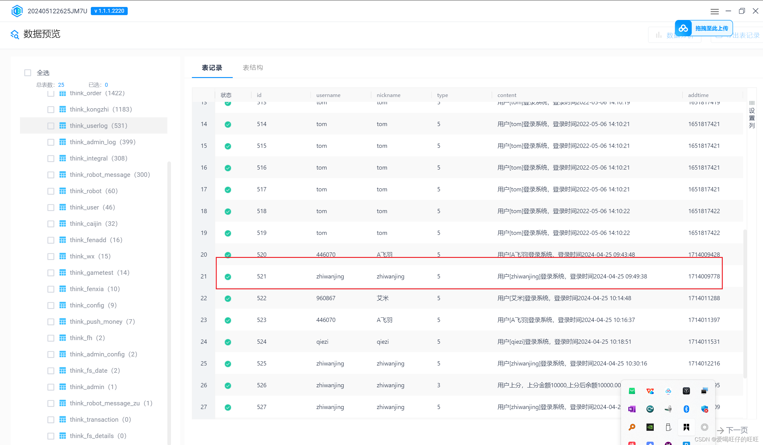 再将sql文件导入数据分析工具当中 查看userlog表 结合受害人的聊天记录可以判断受害人第一次成功登录网站的时间为