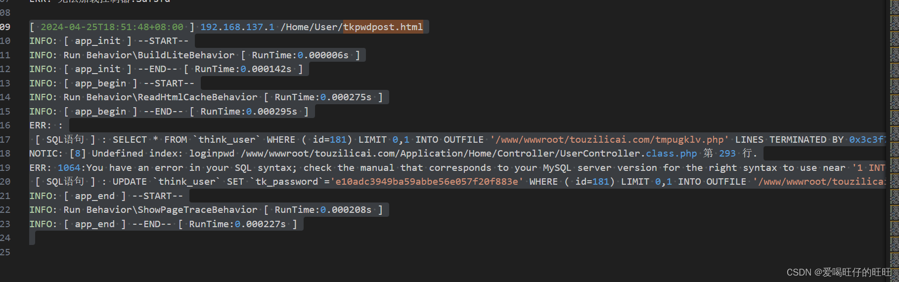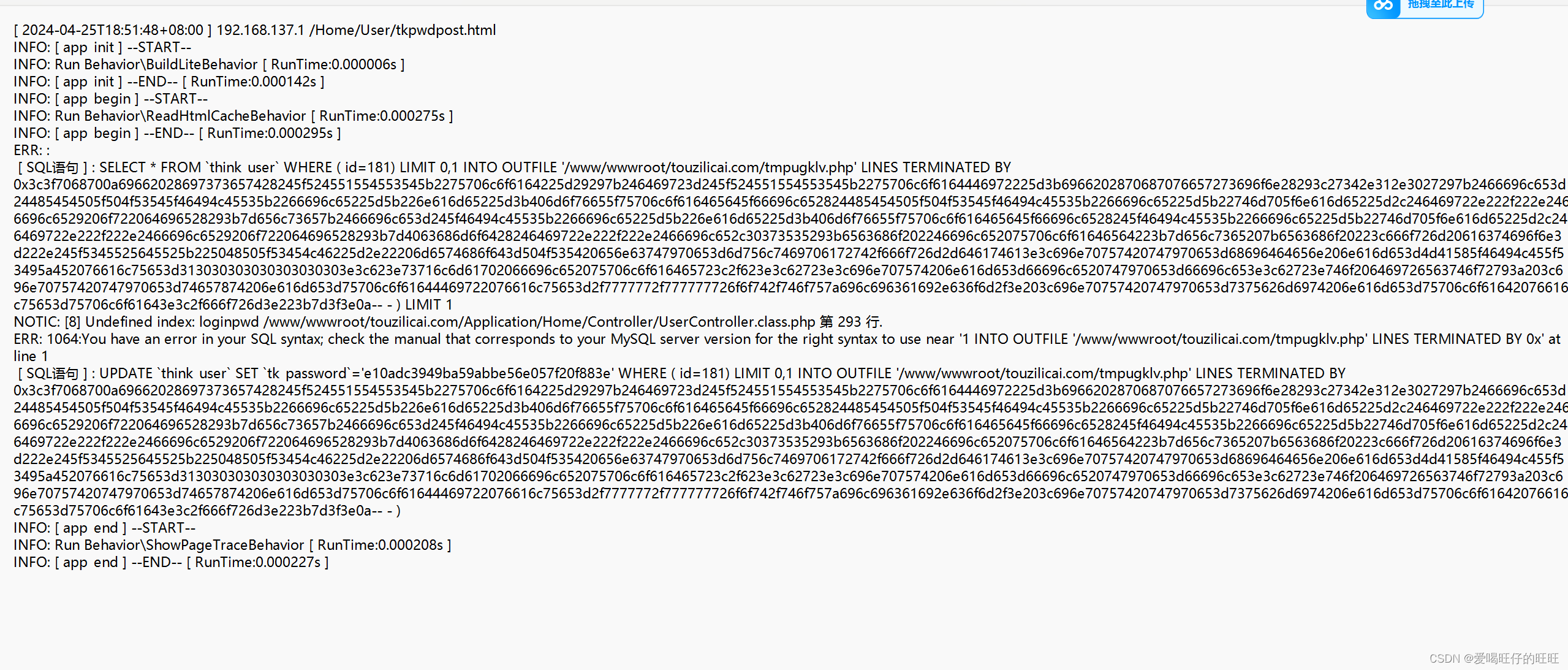 根据修改时间判断也是后续上传上去的文件 继续向前回溯 18时51分48秒的时候通过sql注入将tmpugklv.php 写道网站当中