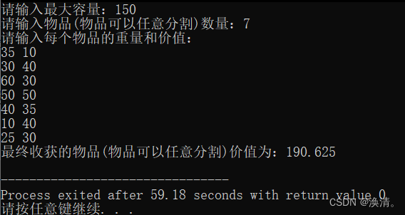 #include<bits/stdc++.h>using namespace std;const int maxn = 1000;float z[maxn]; void Sort(int n,float w[],float v[]){for(int i=0;i<n;i++)z[i]=v[i]/w[i];//用z[]存物品的单位重量价值 for(int i=0;i<n;i++){//此排序的策略是每次把单位重量物品的价值最大的物品放在前面 for(int j=i+1;j<n;j++){if(z[i]<z[j]){float temp = z[i];z[i] = z[j];z[j]=temp;float tempw = w[i];w[i] = w[j];w[j] = tempw;float tempv = v[i];v[i] = v[j];v[j] = tempv; }}}} void fire(int n,float w[],float v[],float x[],float pimax){Sort(n,w,v);//根据单位重量物品的价值对物品进行排序 int i;for(i=0;i<n;i++){if(w[i]>pimax)break;x[i] = 1;//x[]数组用来记录此次是否选择物品,1代表全部拿走,0代表不拿,小数代表部分拿 pimax -= w[i];}if(i<=n-1) x[i] = pimax/w[i]; } int main(){int n;float pi=0; float pimax,v[maxn],w[maxn],x[maxn];//w[],每个物品的重量,v[]代表每个物品的价值,pimax代表最大容量 memset(x,0,sizeof(x));cout<<"请输入最大容量:";cin>>pimax;cout<<"请输入物品(物品可以任意分割)数量:";cin>>n;cout<<"请输入每个物品的重量和价值:"<<endl;for(int i=0;i<n;i++){cin>>w[i]>>v[i];}fire(n,w,v,x,pimax);for(int i=0;i<n;i++){if(x[i]==1){pi+=v[i];}else{pi+=v[i]*x[i];}}cout<<"最终收获的物品(物品可以任意分割)价值为:"<<pi<<endl;return 0;}