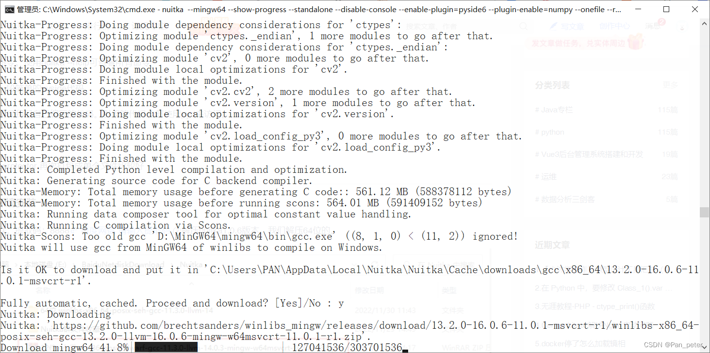 Nuitka2.0已经升级,如果我们缺少他需要的环境,他会自己去github上面下载(我们只需要耐心等待即可)如果觉得下载慢,就自己下载对应的环境吧!老版教程链接(Nuitka环境安装):https://blog.51cto.com/u_14121041/64146982.1、打包常用命令(使用nuitka --help可查看所有命令)