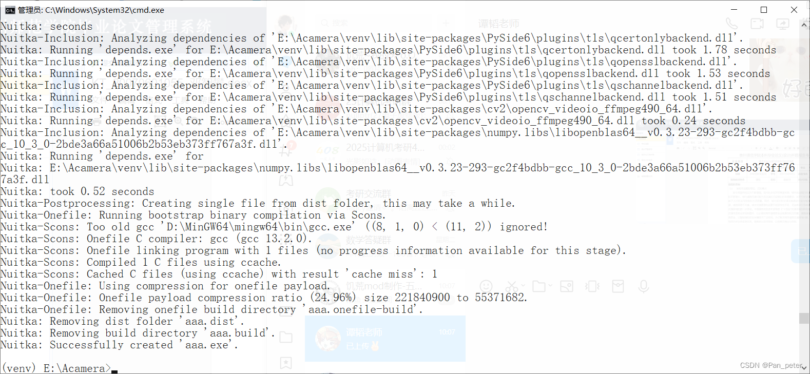 这个命令会使用Nuitka和MinGW64编译器来打包一个名为camera.py