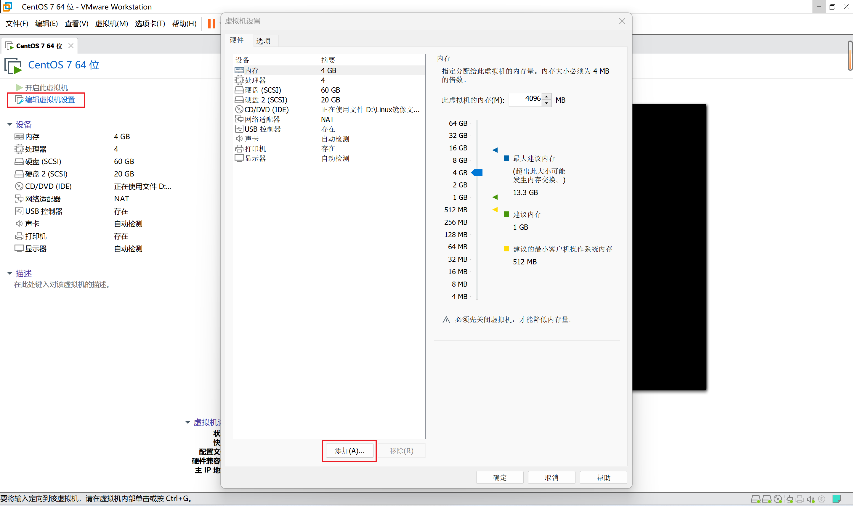1.在虚拟机处选择编辑虚拟机设置,然后选择添加