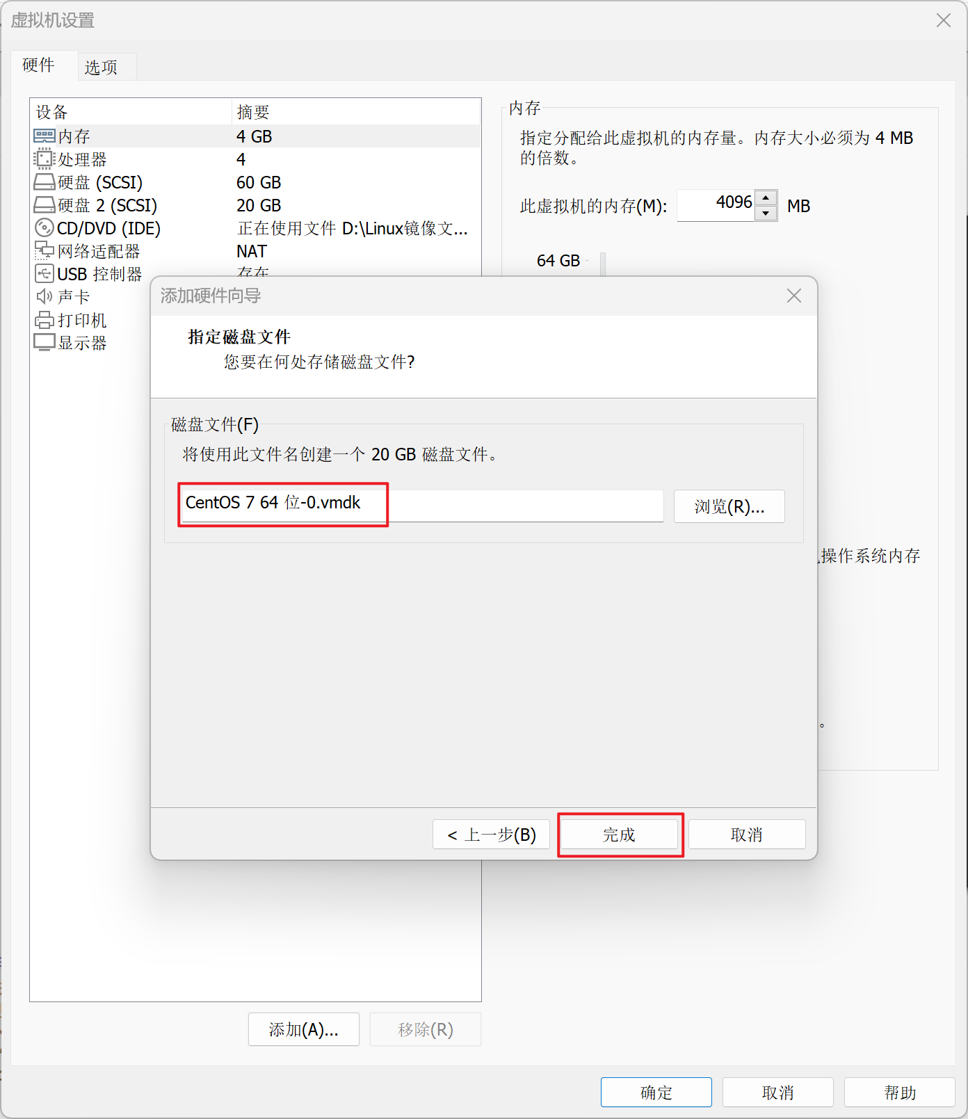 6.设置新磁盘名称,可以选择存储位置,也可以直接默认选择完成,会将磁盘存储在虚拟机系统同级目录
