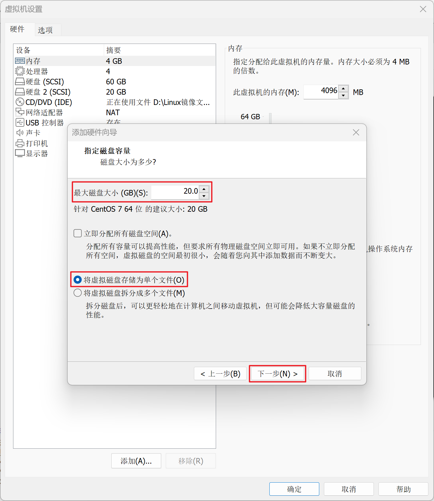 5.设置自己需要磁盘大小,然后选择将虚拟磁盘存储为单个文件这一项,下一步