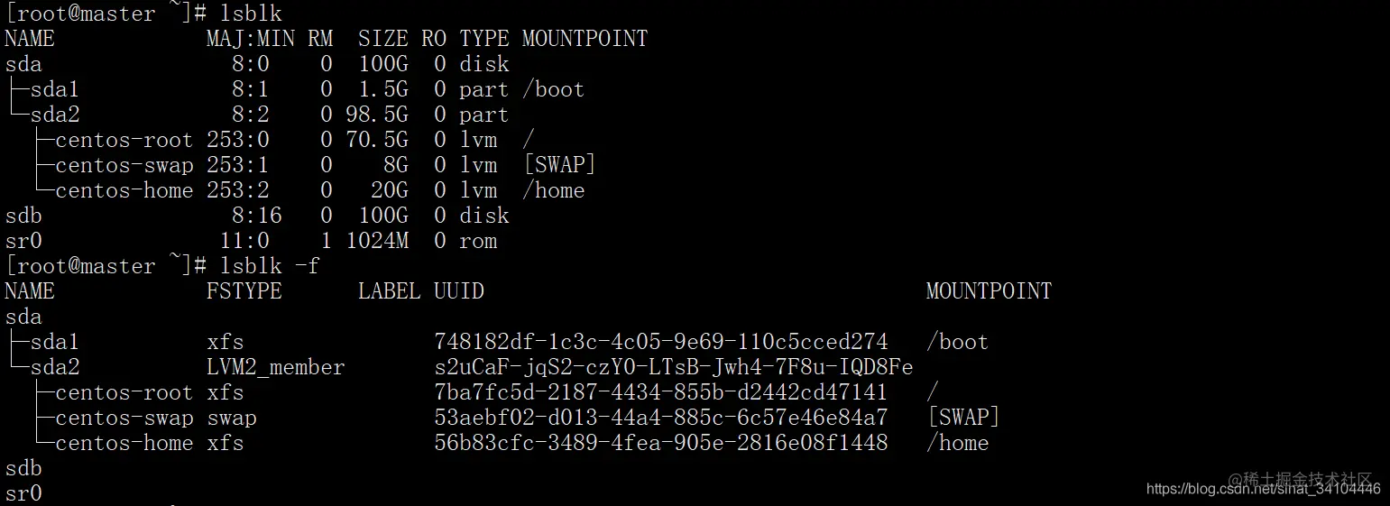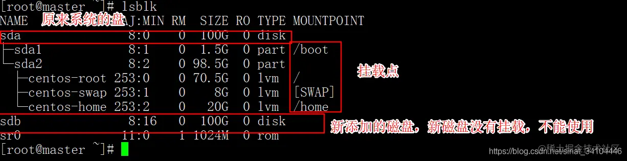 2.使用命令 lsblk 可以查看磁盘的大小和挂载情况